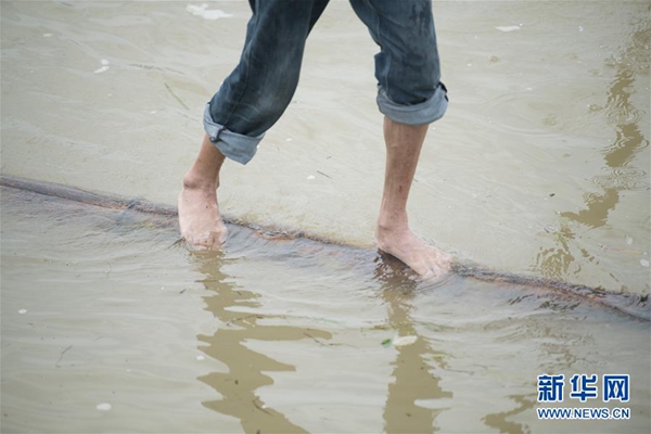7月11日,方恕云站在一根毛竹上橫渡新安江。新華社記者 翁忻旸 攝