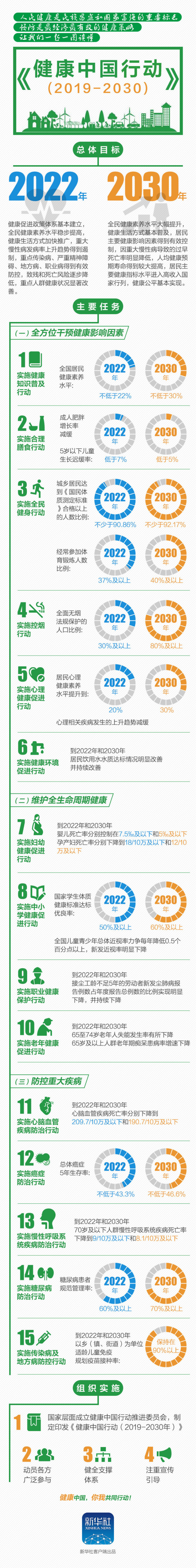 (一)加強(qiáng)組織領(lǐng)導(dǎo)。國家層面成立健康中國行動(dòng)推進(jìn)委員會(huì),制定印發(fā)《健康中國行動(dòng)(2019-2030年)》,細(xì)化上述15個(gè)專項(xiàng)行動(dòng)的目標(biāo)、指標(biāo)、任務(wù)和職責(zé)分工,統(tǒng)籌指導(dǎo)各地區(qū)各相關(guān)部門加強(qiáng)協(xié)作,研究疾病的綜合防治策略,做好監(jiān)測(cè)考核。要根據(jù)醫(yī)學(xué)進(jìn)步和相關(guān)技術(shù)發(fā)展等情況,適時(shí)組織修訂完善《健康中國行動(dòng)(2019-2030年)》內(nèi)容。各地區(qū)要結(jié)合實(shí)際健全領(lǐng)導(dǎo)推進(jìn)工作機(jī)制,研究制定實(shí)施方案,逐項(xiàng)抓好任務(wù)落實(shí)。各相關(guān)部門要按照職責(zé)分工,將預(yù)防為主、防病在先融入各項(xiàng)政策舉措中,研究具體政策措施,推動(dòng)落實(shí)重點(diǎn)任務(wù)。
