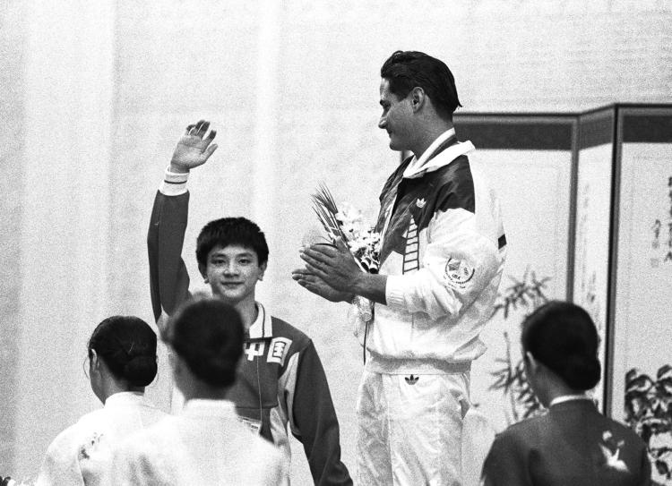 1988年9月27日,獲第24屆奧運(yùn)會男子跳臺跳水銀牌的中國選手熊倪在領(lǐng)獎臺上向觀眾致意。新華社記者 韓居策 攝