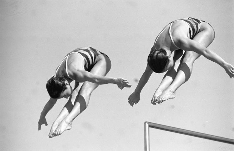 1995年5月14日,熊敏和郭晶晶(左)在美國佛羅里達(dá)州勞德代爾堡舉行的“阿拉莫國際跳水系列大獎賽”美國站比賽中。新華社記者 宋曉剛 攝