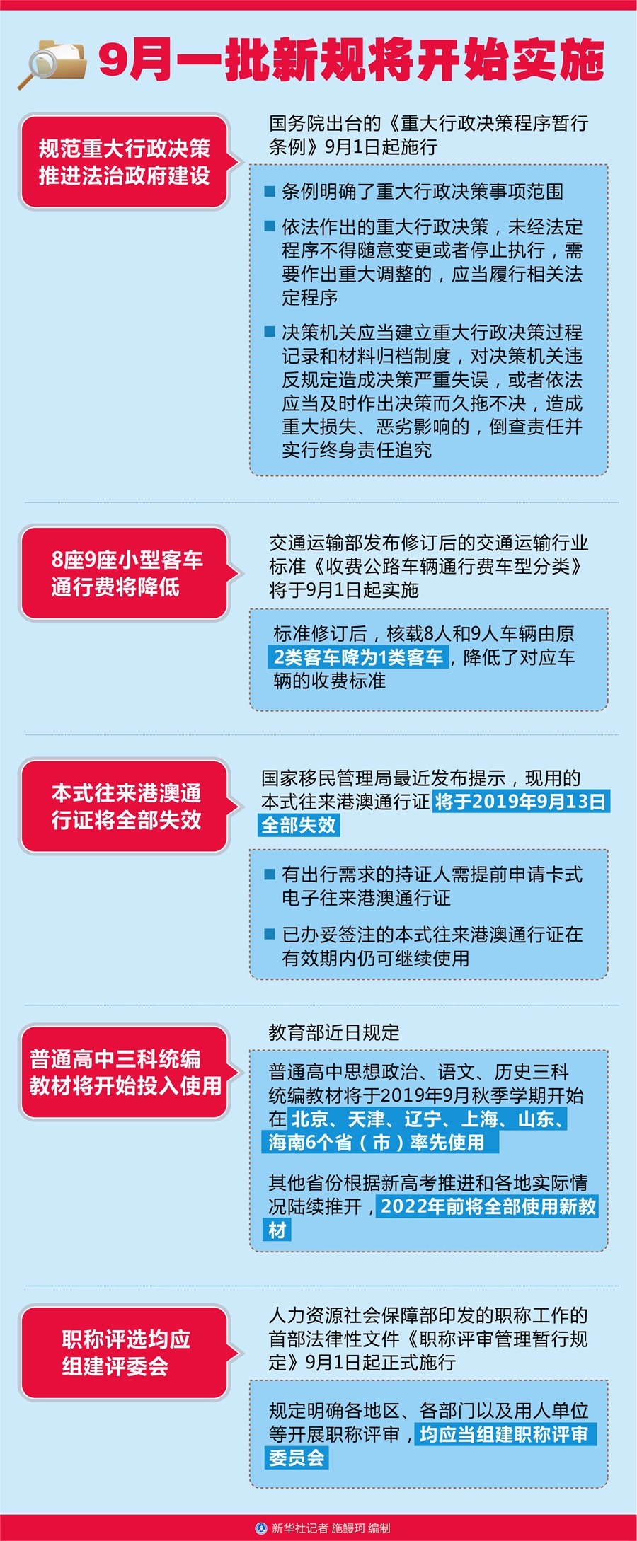規(guī)范重大行政決策,推進(jìn)法治政府建設(shè);8座9座小型客車通行費(fèi)將降低;本式往來港澳通行證將全部失效;普通高中三科統(tǒng)編教材將開始投入使用;職稱評選均應(yīng)組建評委會……9月一批新規(guī)將開始實(shí)施。