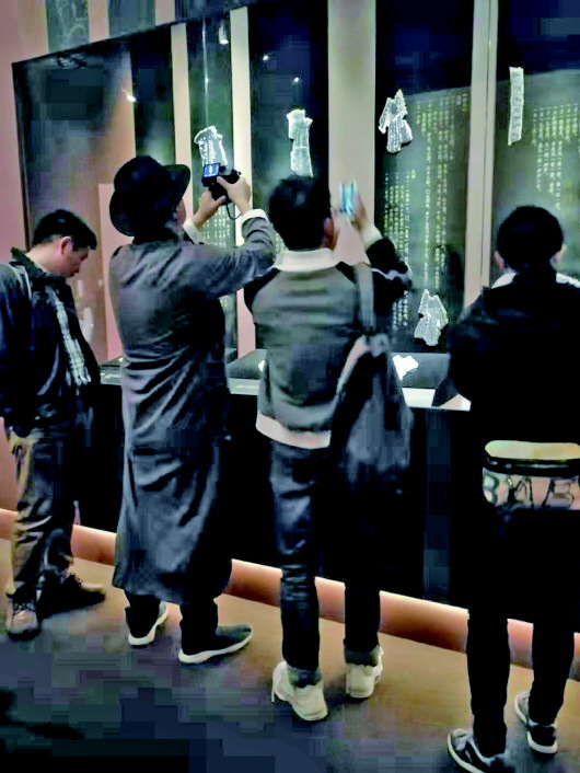 開幕是在工作日的下午,記者竟在展廳里看到人流如織——從牽著幼兒的母親到耄耋老者,無一不滿眼欣喜,或駐足研究或瀏覽拍照,其中不乏著古裝與民國造型者,在幽靜的展廳中與展品融為有機的一體。中國文字協會會長、清華大學教授黃德寬現場接受采訪時,觀眾也圍了一圈又一圈,在記者們提問之間不時拋出自己的問題,讓黃教授嘖嘖稱嘆。