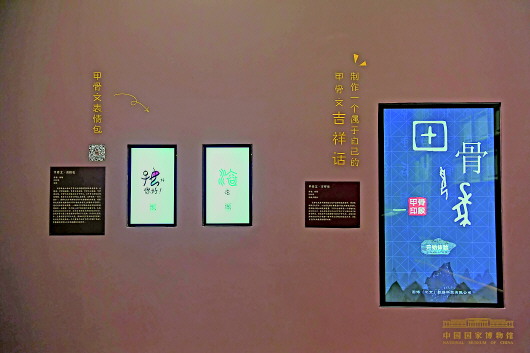 國博的甲骨文文化展雖沒有這么跌宕起伏的故事做注解,但融入信息時代特色的展示手段同樣為“科普”增色。趙永說:“觀眾有興趣來看很重要,但一般的甲骨都很小、很脆,觀賞性并不強。再就是看不懂文字,這個不是看看展板就能理解透的。所以做了一些多媒體的東西,包括甲骨文表情包、手繪甲骨文吉利話、全息甲骨文宇宙等?!?/p>