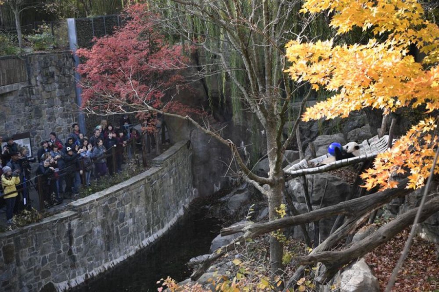 11月11日,在美國國家動(dòng)物園,“貝貝”和游客見面。新華社記者劉杰攝