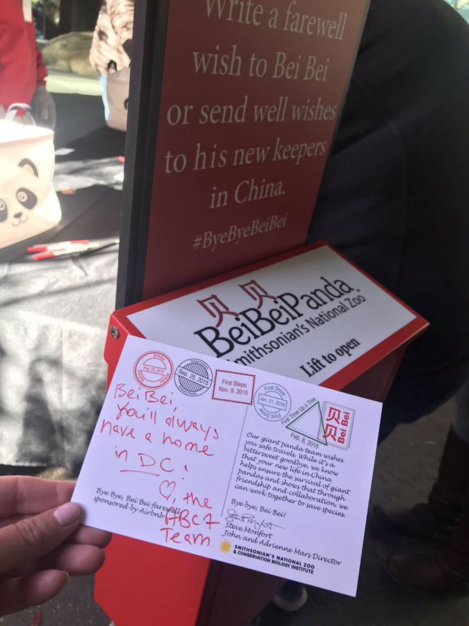當(dāng)?shù)谹BC7電視臺(tái)記者卡蒂·基羅斯在社交媒體上“秀”出了團(tuán)隊(duì)給“貝貝”寫的明信片。上面寫道,“貝貝,你在華盛頓永遠(yuǎn)有個(gè)家!”(圖片來自社交媒體)