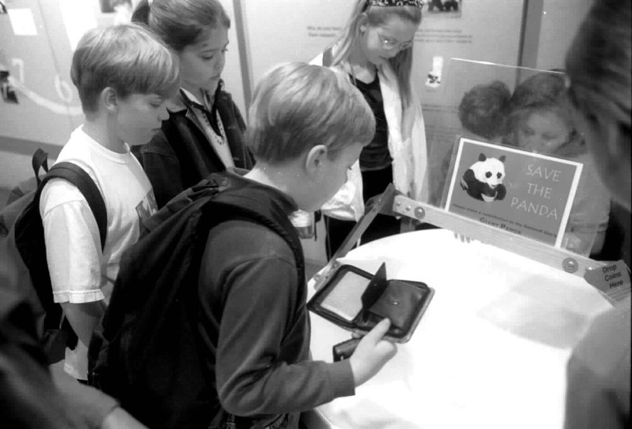 2000年5月21日,一些孩子在美國國家動(dòng)物園大熊貓館內(nèi)為拯救大熊貓基金會(huì)捐獻(xiàn)硬幣。新華社記者王巖攝(傳真照片)