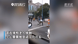 在上海,一名輔警為背老人過馬路單膝下跪。
