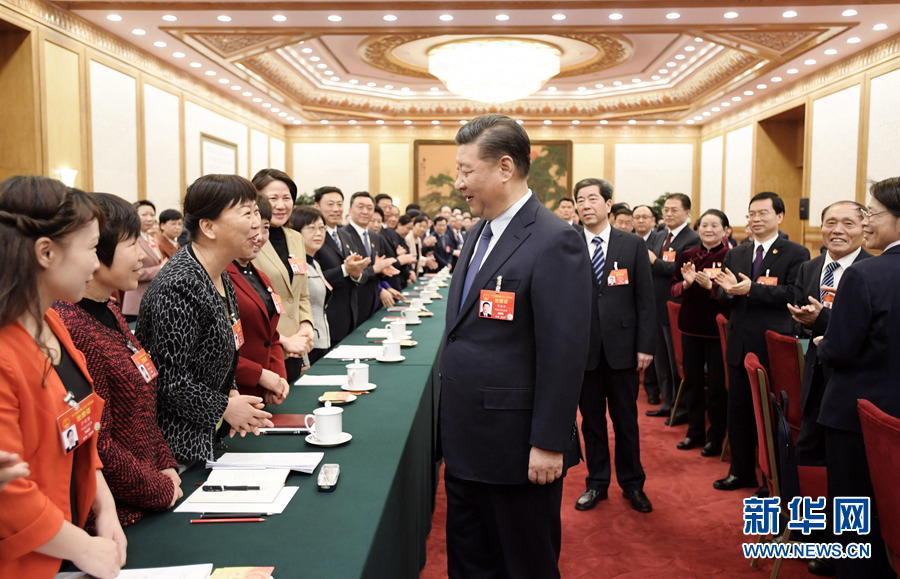 3月8日,中共中央總書記、國家主席、中央軍委主席習近平參加十三屆全國人大二次會議河南代表團的審議。在“三八”國際勞動婦女節到來之際,習近平代表黨中央,向參加全國兩會的女代表、女委員、女工作人員,向全國各族各界婦女,致以節日的祝賀和美好的祝福。這是習近平同女代表親切交談。新華社記者 李學仁 攝