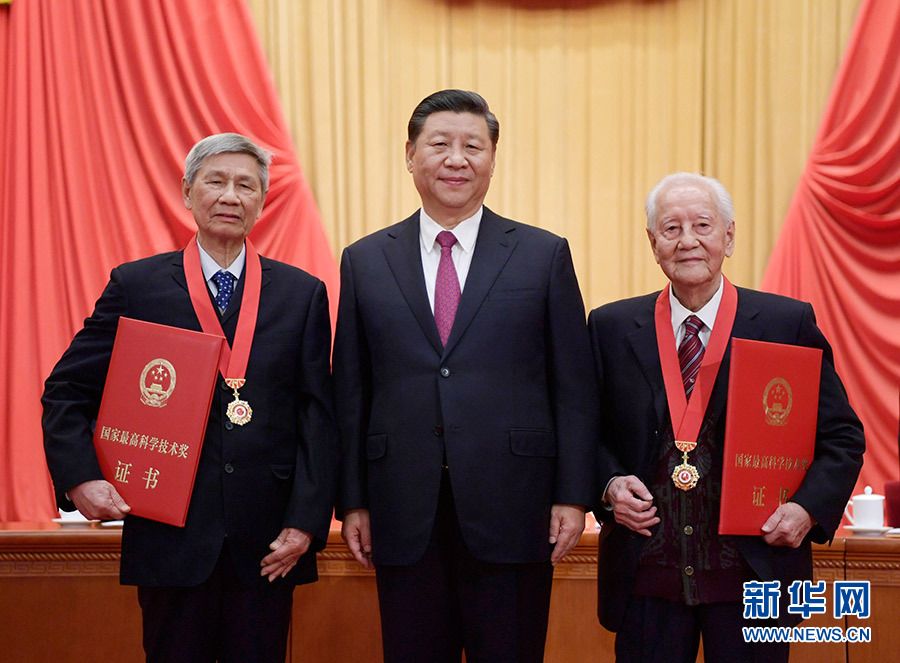 1月10日,2019年度國家科學(xué)技術(shù)獎勵大會在北京人民大會堂隆重舉行。中共中央總書記、國家主席、中央軍委主席習(xí)近平向獲得2019年度國家最高科學(xué)技術(shù)獎的原中國船舶重工集團(tuán)公司第七一九研究所黃旭華院士(右)和中國科學(xué)院大氣物理研究所曾慶存院士(左)頒獎。 新華社發(fā)(盛佳鵬 攝)