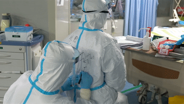 穿上隔離服的醫護人員只能露出一雙眼睛,誰也認不出對方,于是他們進入隔離區的第一件事,就是相互在隔離服上寫下對方的名字或者外號,有時還會藝術創作一下,這成了隔離病房里“神秘的儀式”。