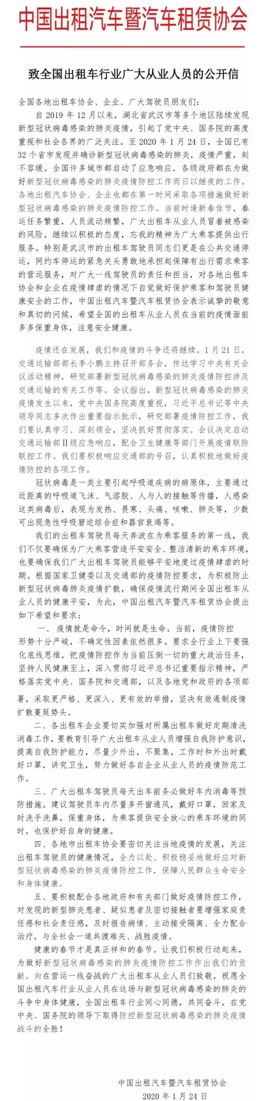 近日,中國出租汽車暨汽車租賃協(xié)會發(fā)布公開信,倡議全國出租車行業(yè)廣大從業(yè)人員把疫情防控作為當(dāng)前壓倒一切的重大政治任務(wù)。出租車駕駛員每天出車前務(wù)必做好車內(nèi)消毒等預(yù)防措施,采取更嚴(yán)格、更深入、更有效的舉措,堅決有效遏制疫情擴(kuò)散蔓延勢頭。?