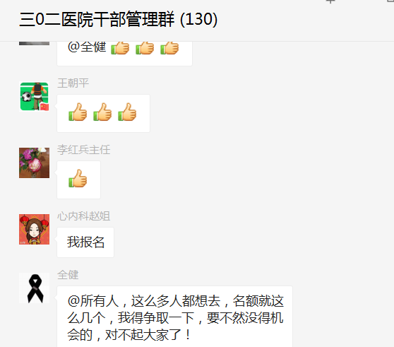 在航空工業通用醫療三〇二醫院的微信群里,有一位檢驗科醫生@院長申請赴一線。陳述完專業理由后他提了個特殊理由:“我們醫院這么多人出去,吃不慣也不好,我做菜還是很好吃的,給他們做后勤保障絕對也沒問題。帶上我只有好處沒有壞處,我也不會給組織拖后腿,希望院長給我爭取一下,謝謝!”他說這么多人都想去,名額就這么幾個,他不爭取一下就沒得機會的,對不起大家了!