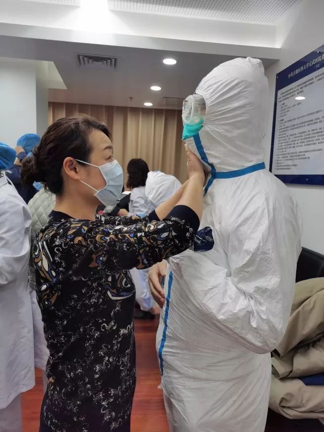 ?。▓D說:出發(fā)前,首都醫(yī)科大學宣武醫(yī)院在全員培訓的基礎(chǔ)上,對醫(yī)護人員進行穿脫防護服等感染防控加強培訓。在現(xiàn)場,首都醫(yī)科大學宣武醫(yī)院呼吸科副主任醫(yī)師肖漢(右),他的愛人北京醫(yī)院醫(yī)務(wù)處副處長潘琪(左)正在用自己的專業(yè)知識,幫助丈夫規(guī)范穿戴防護服。)