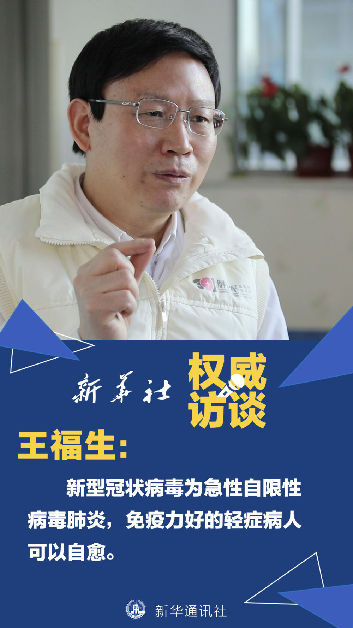 王福生:給大家普及一個概念,新型冠狀病毒肺炎它本身是一種急性自限性的疾病。什么叫自限性的呢?有的輕癥病人,他不經(jīng)過治療可以自己好,其它重癥病例通過治療才能恢復(fù)。這個過程中間,他有一種叫自己好的“自愈”,所以說我覺得“自愈”加上“治愈”,如果他癥狀輕,肺部的病變不嚴(yán)重,免疫力又比較好,這樣通過自身抗病毒的能力,就很快地把病毒控制了,但這可能得有3周左右。