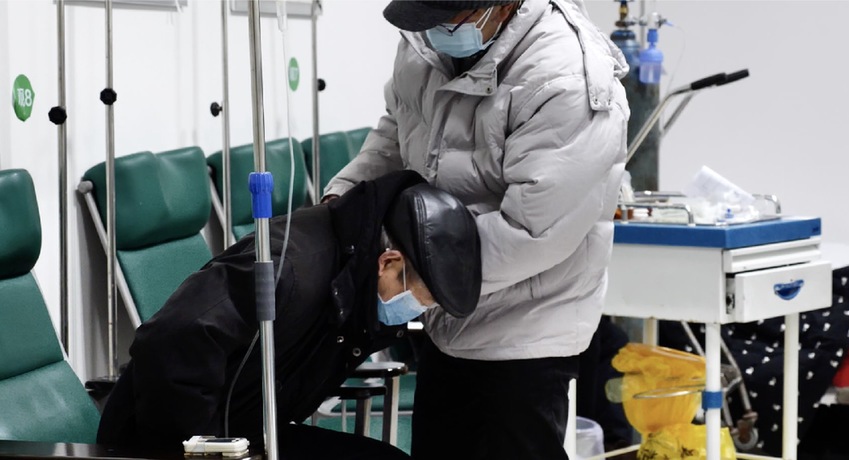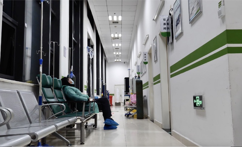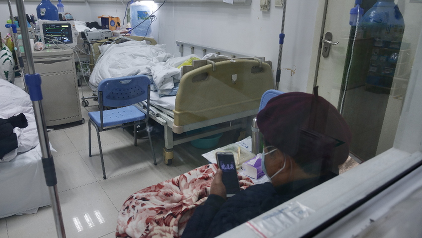 晚上十點(diǎn)鐘,發(fā)熱門診里僅能聽見護(hù)士的腳步聲,患者的咳嗽與喘氣聲。留觀室大多數(shù)病人已經(jīng)入睡,但有一位戴著棗紅色帽子的老爺爺,他插著氧氣管仍坐著,捧著手機(jī)看電視劇。