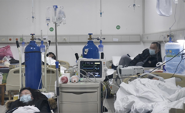 留觀室里的患者,幾乎每個(gè)人身邊立著一個(gè)近一人高的氧氣鋼瓶,更有病情嚴(yán)重者用上了呼吸機(jī)。他們大多數(shù)人坐在病床上,時(shí)而躺下,沒有交談。有的患者見到醫(yī)生時(shí)會(huì)哭泣;有的患者吸著氧,靜靜地發(fā)呆,眼睛沒有神。