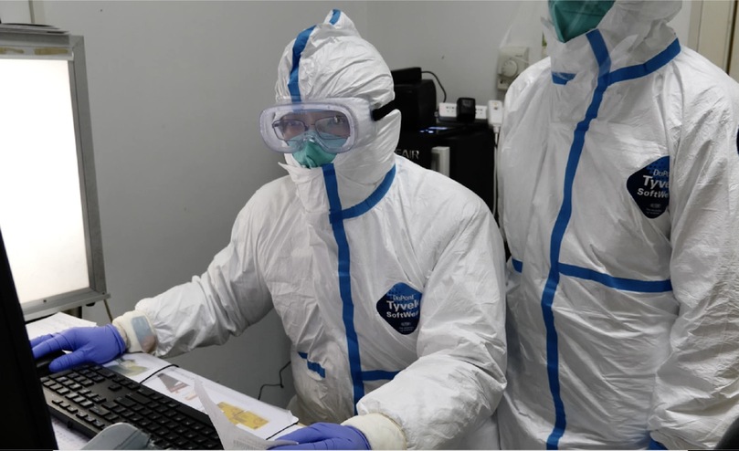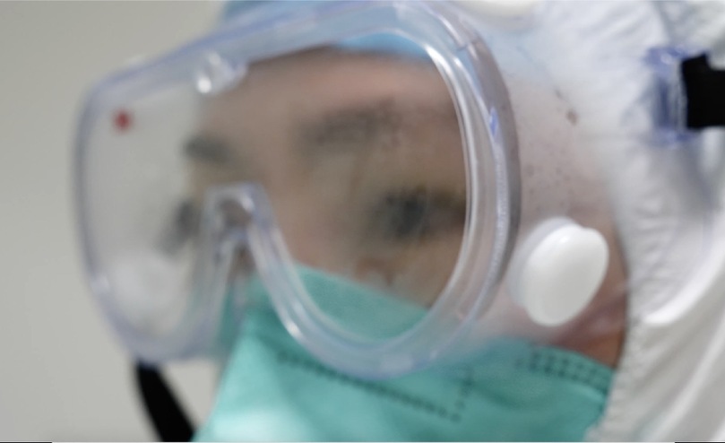 三層外科手套、一層頭套、一副面屏外加防護(hù)服,從醫(yī)護(hù)人員通道進(jìn)入隔離通道,才進(jìn)入工作區(qū)域。