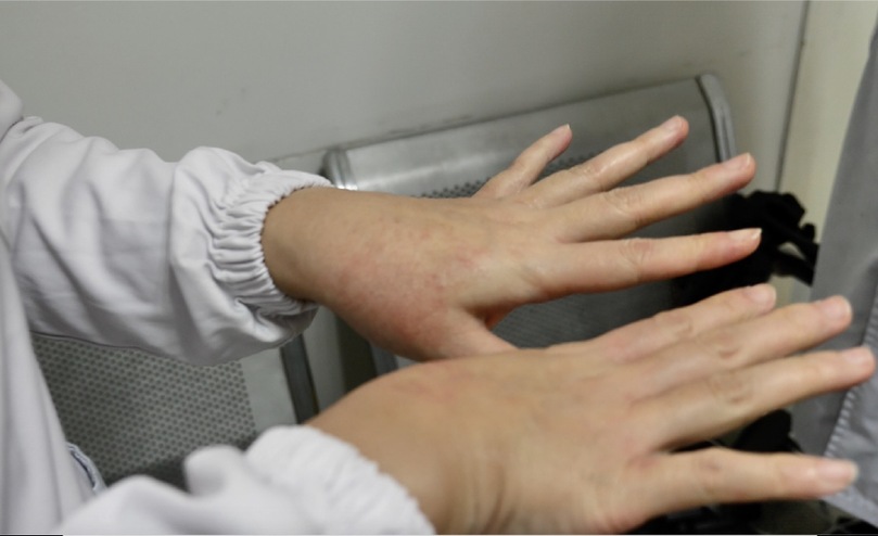 因長(zhǎng)期戴手套,起了濕疹的雙手。