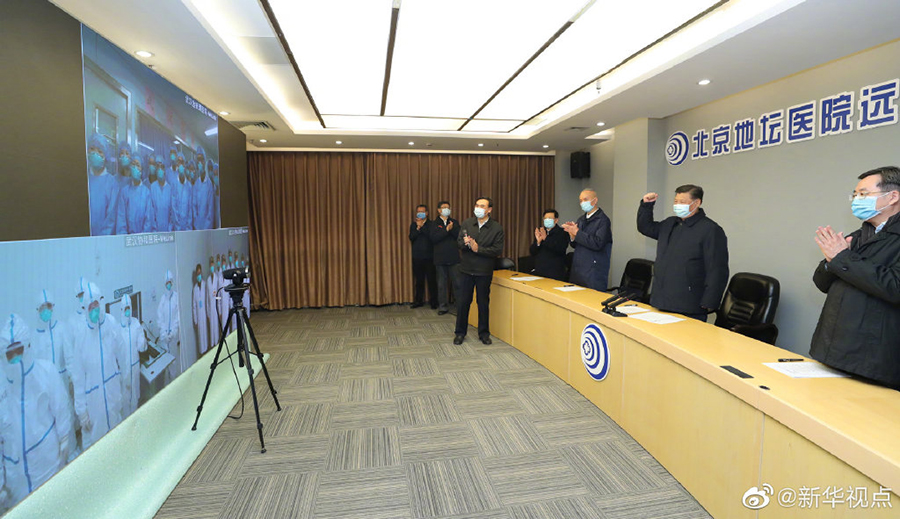10日下午,習近平總書記在北京地壇醫院遠程診療中心,通過視頻連線武漢市收治新冠肺炎患者的金銀潭醫院、協和醫院、火神山醫院,稱贊奮戰在疫情防控一線的廣大醫務工作者、干部職工和人民解放軍指戰員是“火線上的中流砥柱”。習近平指出,當前疫情防控工作正處在膠著對壘的緊要關頭,一定要堅持下去,堅決打贏湖北保衛戰、武漢保衛戰。武漢勝則湖北勝,湖北勝則全國勝。(文字記者張曉松 攝影記者:鞠鵬、謝環馳)