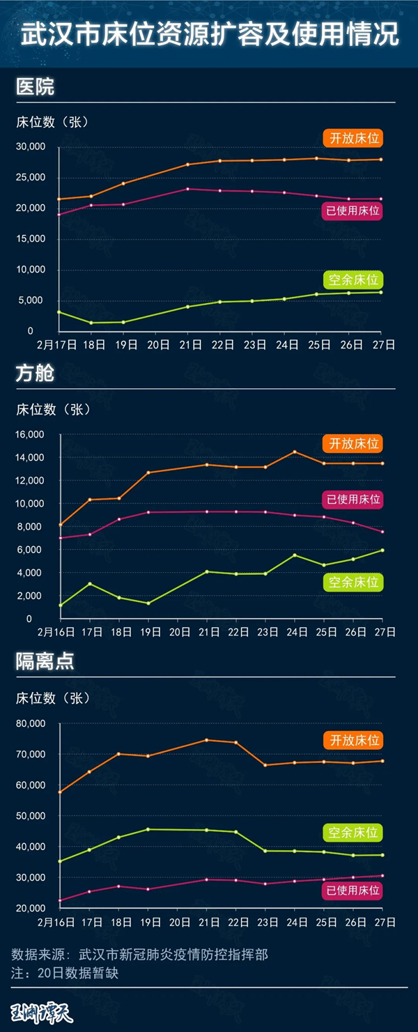 這是2月16日到27日之間,醫(yī)院、方艙和隔離點的床位數(shù)變化。