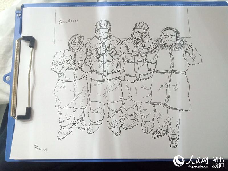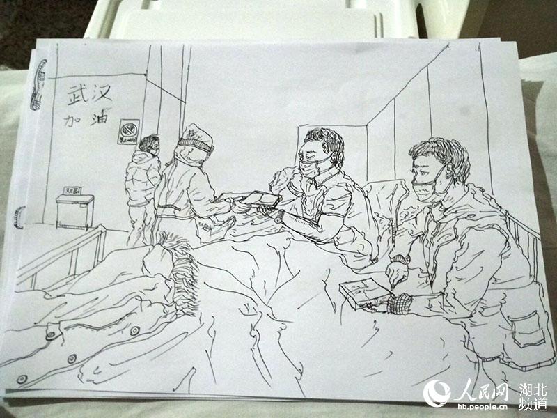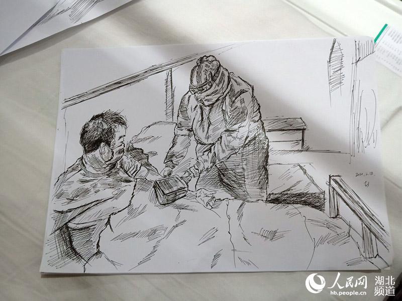 “被照顧得很好”的小彭常??吹结t護人員們穿著厚重的防護服,一忙就是6個小時以上不停歇,連水和飯都得換班以后吃,卻每天依然為患者提供無微不至的照顧。出于感動和感激,彭昕燁向醫護人員借了紙和筆,將方艙醫院溫暖的瞬間畫成素描。