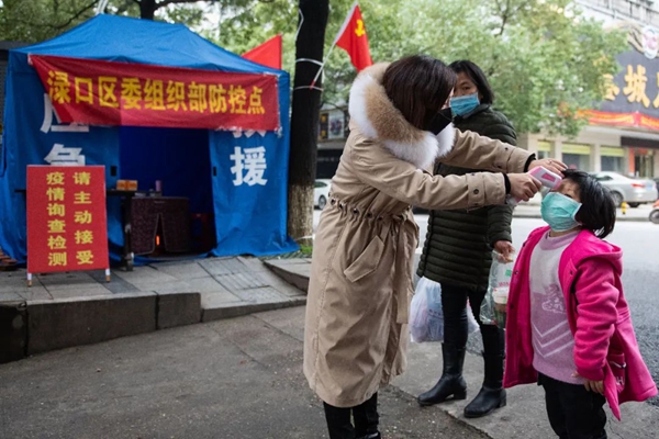 3月4日,在湖南省株洲市淥口區(qū)一住宅小區(qū)前的值守點(diǎn),工作人員為居民測量體溫。新華社發(fā)陳思汗攝