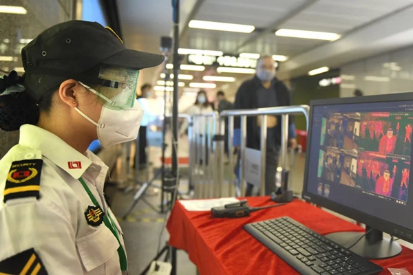 3月9日,在廣州地鐵海珠廣場站,工作人員通過紅外線體溫儀對進(jìn)站乘客體溫進(jìn)行監(jiān)測。新華社記者 盧漢欣 攝