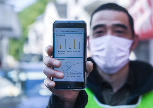 2月20日,在浙江省杭州市富陽區(qū)上官鄉(xiāng)芳村檢查點(diǎn),工作人員展示手機(jī)上的“疫情防控云圖”的實(shí)時數(shù)據(jù)。新華社記者 徐昱 攝