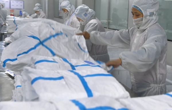 1月27日,安徽省六安市裕安區(qū)一家醫(yī)療科技有限公司的工人在加工防護(hù)服。新華社發(fā)(陳力 攝)