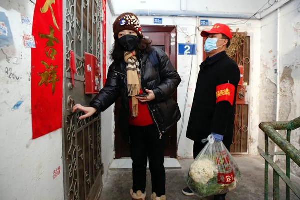 武漢市江岸區(qū)花橋社區(qū)志愿者蔣晨一(左)和下沉社區(qū)的干部謝文先來到一名獨(dú)居老人家為其送菜(2月20日攝)。新華社記者沈伯韓攝