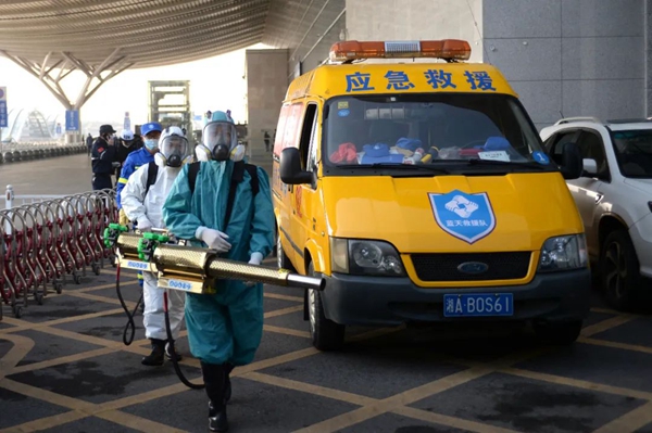 2月5日,長沙藍(lán)天救援隊(duì)隊(duì)員準(zhǔn)備進(jìn)入長沙磁浮高鐵站消毒殺菌。新華社發(fā)(陳振海攝)