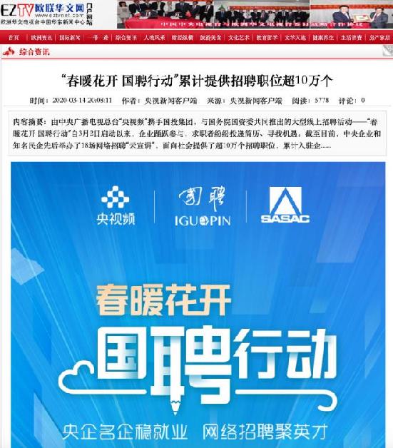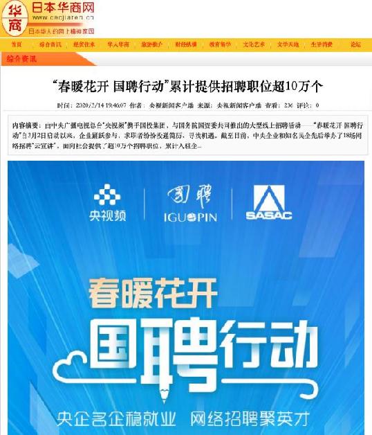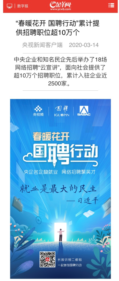 由中央廣播電視總臺“央視頻”攜手國投集團,與國務院國資委共同推出的大型線上招聘活動——“春暖花開 國聘行動”,自3月2日啟動以來,企業(yè)踴躍參與,求職者紛紛投遞簡歷。截至3月14日已面向社會提供了超10萬個招聘職位,累計入駐企業(yè)近2500家,引發(fā)眾多媒體和網(wǎng)站轉載報道。