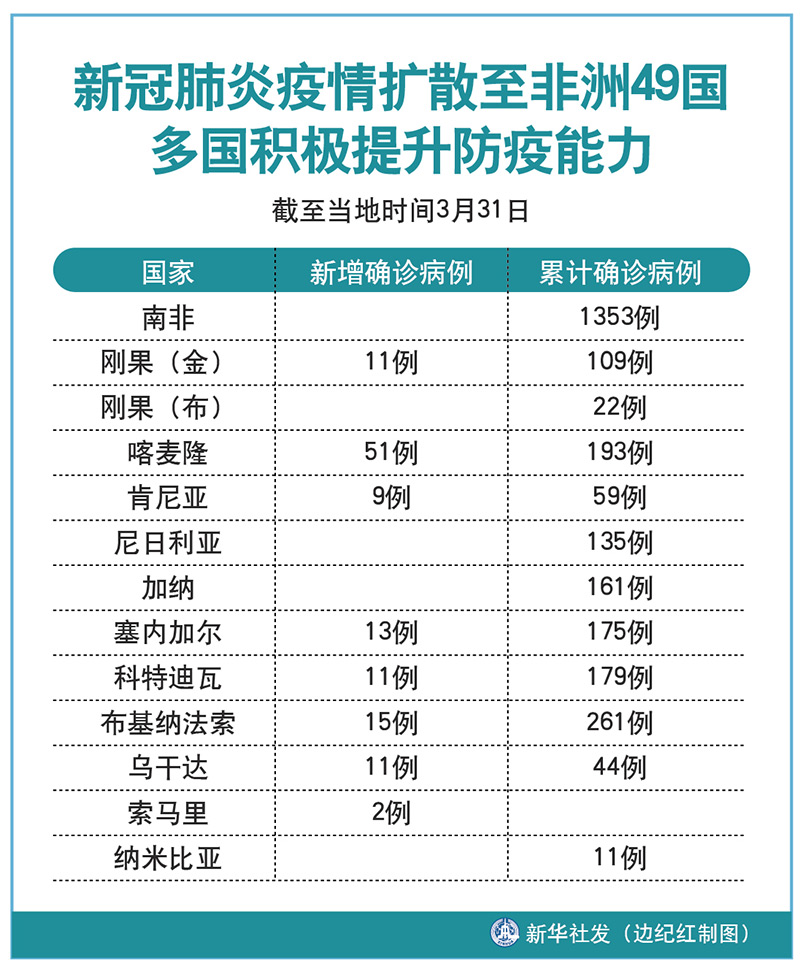 截至31日,剛果(金)新增確診病例11例,累計109例;剛果(布)累計22例;喀麥隆新增51例,累計193例;肯尼亞新增9例,累計59例;尼日利亞累計135例;加納累計161例;塞內加爾新增13例,累計175例;科特迪瓦新增11例,累計179例;布基納法索新增15例,累計261例;烏干達新增11例,累計44例;索馬里新增2例;納米比亞累計11例。