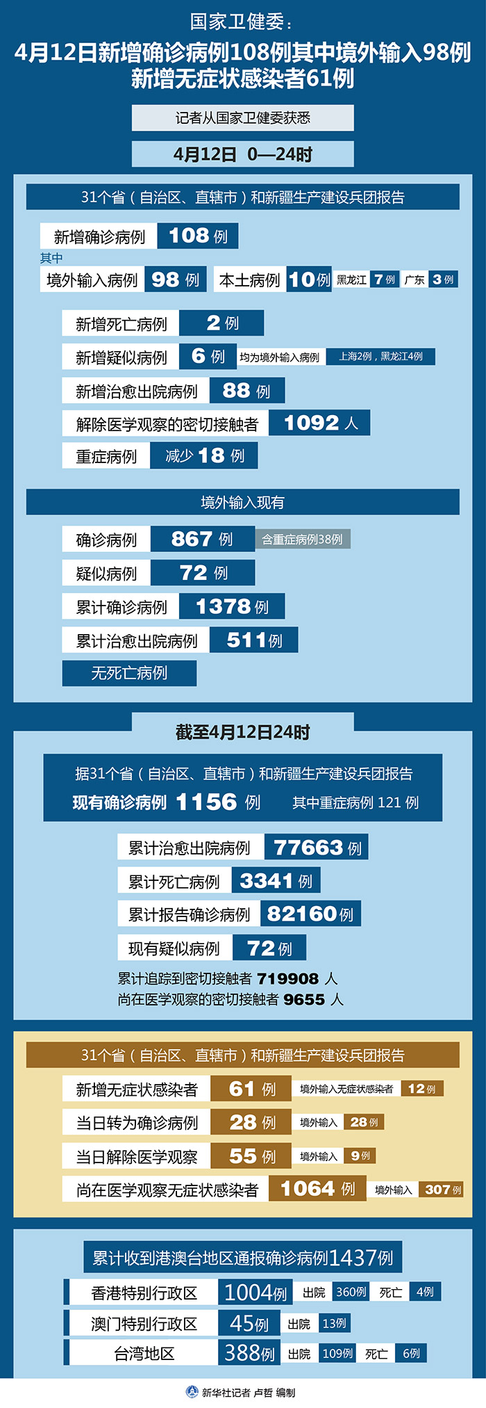 截至4月12日24時,據31個省(自治區、直轄市)和新疆生產建設兵團報告,現有確診病例1156例(其中重癥病例121例),累計治愈出院病例77663例,累計死亡病例3341例,累計報告確診病例82160例,現有疑似病例72例。累計追蹤到密切接觸者719908人,尚在醫學觀察的密切接觸者9655人。
