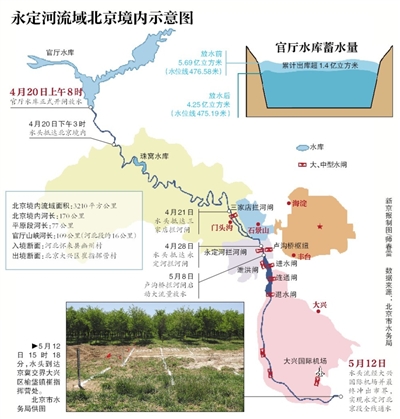 4月20日8時(shí),官廳水庫開閘放水,截至5月12日15時(shí)18分,官廳水庫水位已由476.58米(蓄水量5.69億立方米)降至475.19米(蓄水量4.25億立方米),累計(jì)出庫超1.4億立方米。