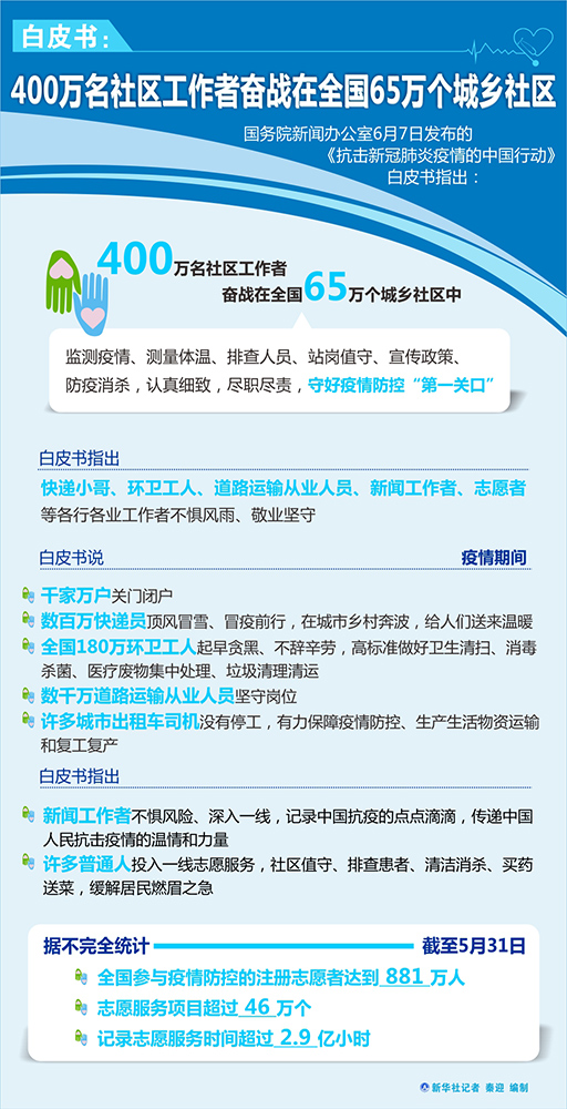 新華社北京6月7日電(記者王琳琳)國務院新聞辦公室7日發(fā)布的《抗擊新冠肺炎疫情的中國行動》白皮書指出,400萬名社區(qū)工作者奮戰(zhàn)在全國65萬個城鄉(xiāng)社區(qū)中,監(jiān)測疫情、測量體溫、排查人員、站崗值守、宣傳政策、防疫消殺,認真細致,盡職盡責,守好疫情防控“第一關口”。