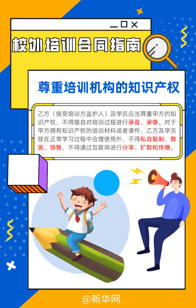 編輯: 盧俊宇 設計: 盧俊宇 2020年06月19日 10:54:51 來源: 新華網長期以來,校外培訓機構的資質問題,以及部分培訓機構存在違規收費、退費難、卷款“跑路”現象,這些令學生和家長發愁。教育部、市場監管總局近日發布《中小學生校外培訓服務合同(示范文本)》,供培訓者(學員)監護人與開展中小學生校外培訓的培訓機構簽訂培訓合同時參照使用,為規范校外培訓做出新的探索。一起來看看,這份“國家版”標準合同有哪些亮點?