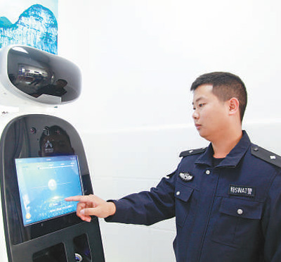 織金縣珠藏鎮警務助理肖發陽在展示智能機器人如何使用。黃 嫻攝