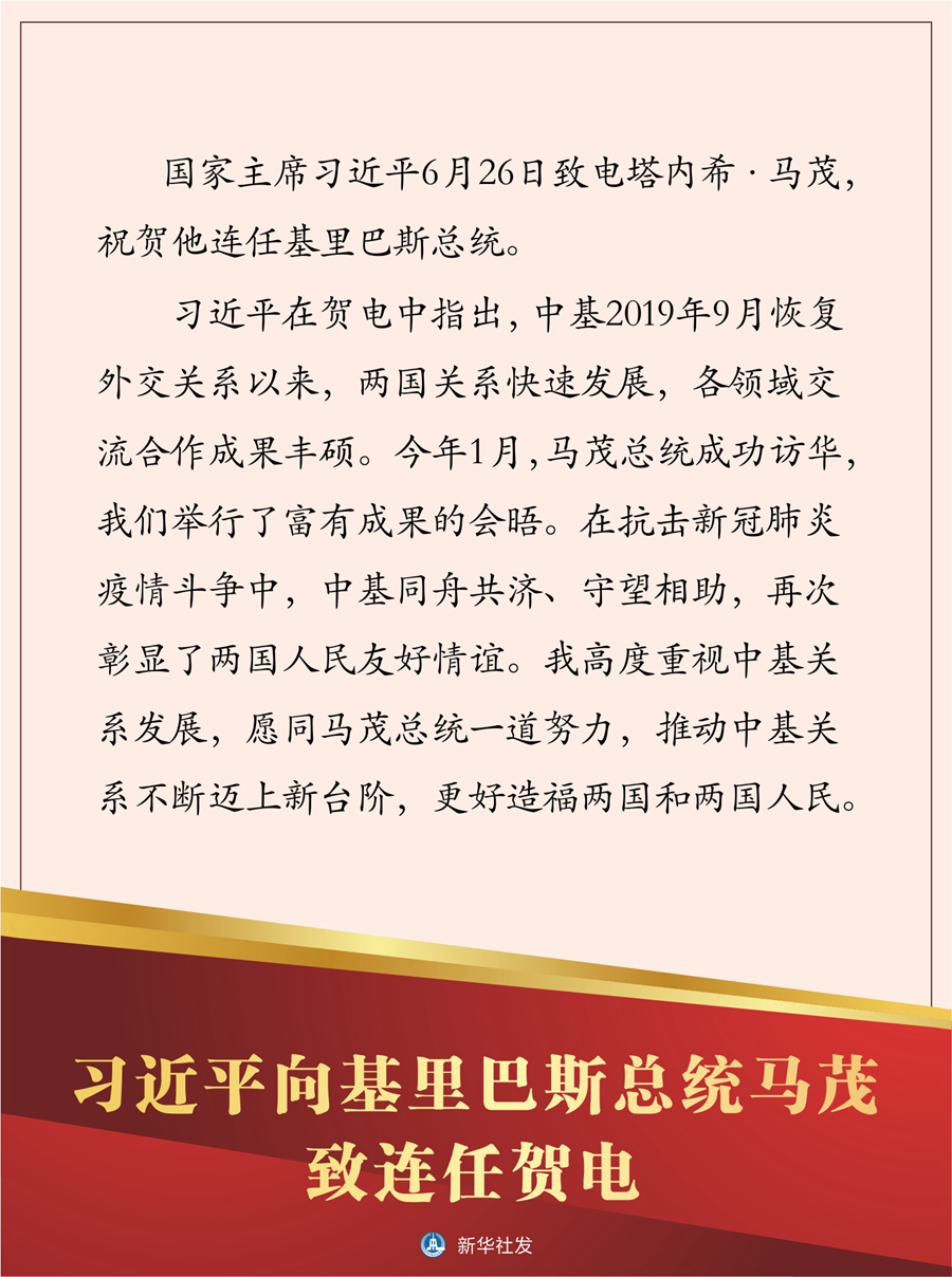 習近平在賀電中指出,中基2019年9月恢復外交關(guān)系以來,兩國關(guān)系快速發(fā)展,各領(lǐng)域交流合作成果豐碩。今年1月,馬茂總統(tǒng)成功訪華,我們舉行了富有成果的會晤。在抗擊新冠肺炎疫情斗爭中,中基同舟共濟、守望相助,再次彰顯了兩國人民友好情誼。我高度重視中基關(guān)系發(fā)展,愿同馬茂總統(tǒng)一道努力,推動中基關(guān)系不斷邁上新臺階,更好造福兩國和兩國人民。