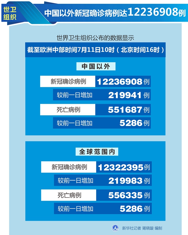 新華社日內瓦7月11日電(記者劉曲)世界衛生組織11日公布的最新數據顯示,中國以外新冠確診病例達到12236908例。