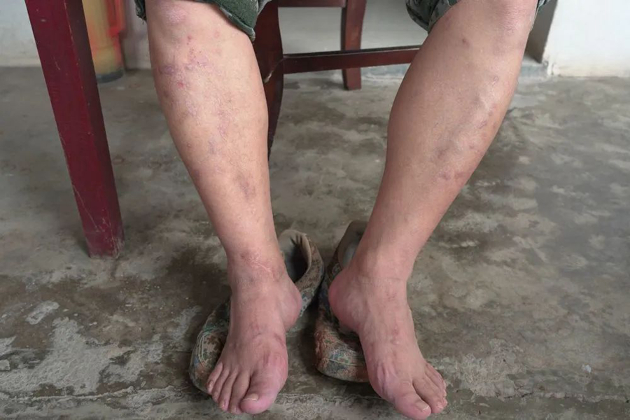 ↑14日,陳壽春的腳已經基本恢復,腿上傷疤依舊明顯。(新華社記者 屈彥攝)
