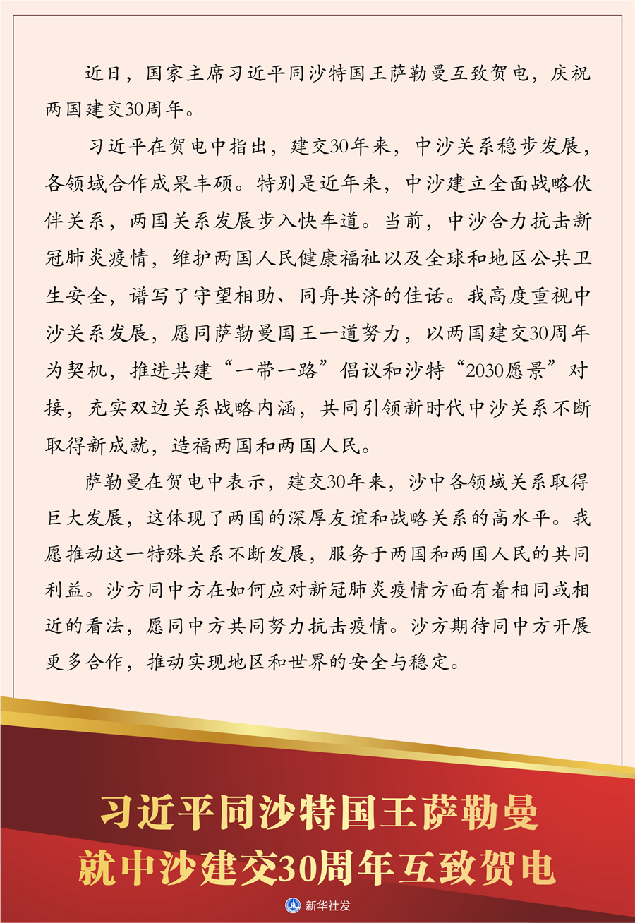 習(xí)近平在賀電中指出,建交30年來,中沙關(guān)系穩(wěn)步發(fā)展,各領(lǐng)域合作成果豐碩。特別是近年來,中沙建立全面戰(zhàn)略伙伴關(guān)系,兩國關(guān)系發(fā)展步入快車道。當(dāng)前,中沙合力抗擊新冠肺炎疫情,維護(hù)兩國人民健康福祉以及全球和地區(qū)公共衛(wèi)生安全,譜寫了守望相助、同舟共濟(jì)的佳話。我高度重視中沙關(guān)系發(fā)展,愿同薩勒曼國王一道努力,以兩國建交30周年為契機(jī),推進(jìn)共建“一帶一路”倡議和沙特“2030愿景”對接,充實雙邊關(guān)系戰(zhàn)略內(nèi)涵,共同引領(lǐng)新時代中沙關(guān)系不斷取得新成就,造福兩國和兩國人民。