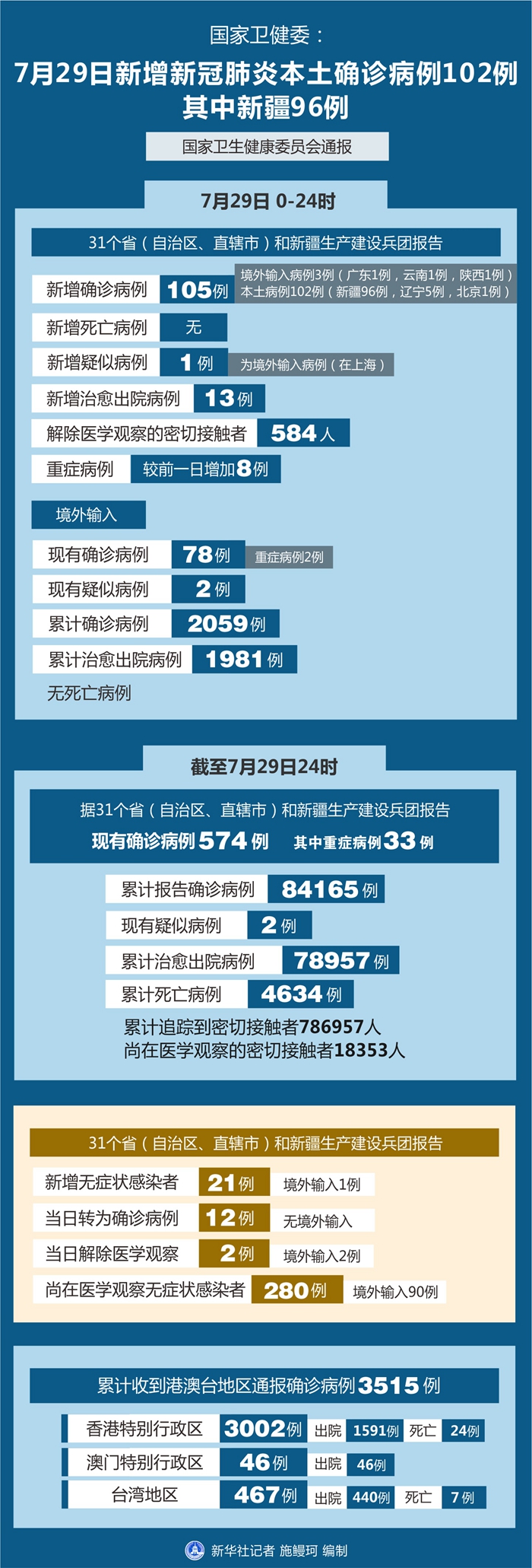 新華社北京7月30日電 國家衛健委30日通報,7月29日0—24時,31個省(自治區、直轄市)和新疆生產建設兵團報告新增確診新冠肺炎病例105例,其中境外輸入病例3例(廣東1例,云南1例,陜西1例),本土病例102例(新疆96例,遼寧5例,北京1例);無新增死亡病例;新增疑似病例1例,為境外輸入病例(在上海)。