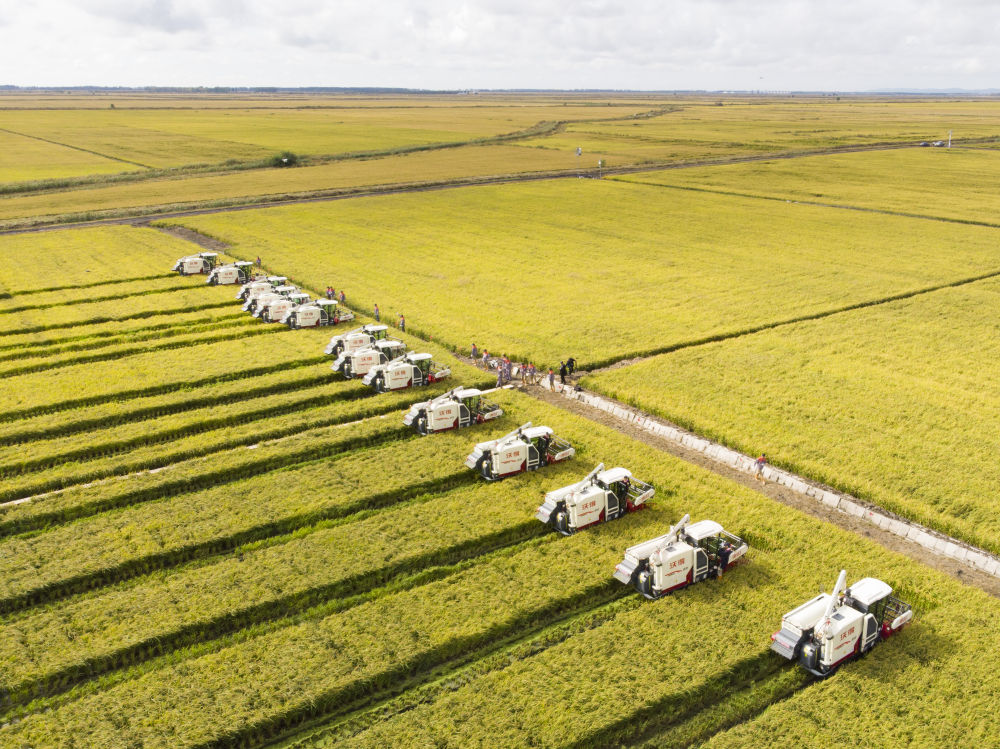 9月22日在黑龍江省富錦市萬畝水稻公園內拍攝的開鐮儀式現場(無人機照片)。新華社發(張濤攝)