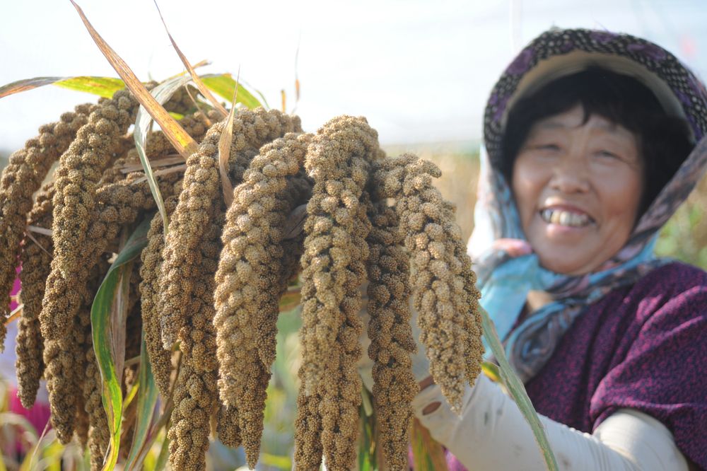 9月22日,山東省煙臺市福山區老官莊村農民展示剛剛收獲的無公害谷子。新華社發(申吉忠 攝)