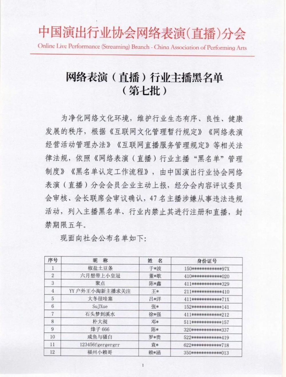 中國(guó)演出行業(yè)協(xié)會(huì)網(wǎng)絡(luò)表演(直播)分會(huì)向社會(huì)公布第七批主播黑名單,47名主播涉嫌從事違法違規(guī)活動(dòng),列入主播黑名單。