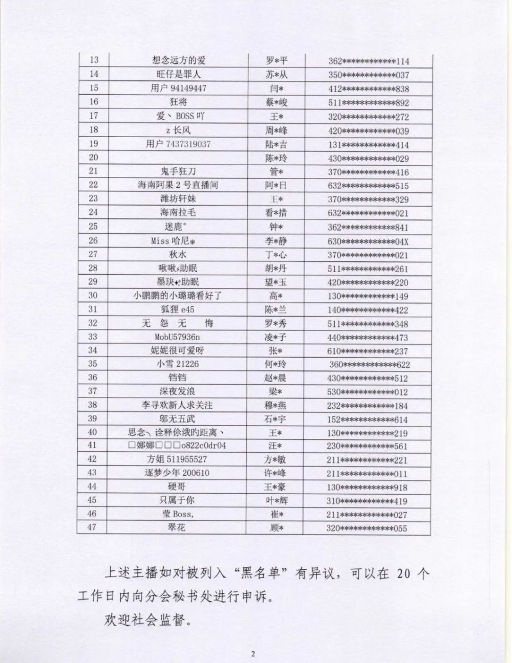 中國(guó)演出行業(yè)協(xié)會(huì)網(wǎng)絡(luò)表演(直播)分會(huì)透露,根據(jù)《互聯(lián)網(wǎng)文化管理暫行規(guī)定》《網(wǎng)絡(luò)表演經(jīng)營(yíng)活動(dòng)管理辦法》《互聯(lián)網(wǎng)直播服務(wù)管理規(guī)定》等相關(guān)法律法規(guī),按照《網(wǎng)絡(luò)表演(直播)行業(yè)主播“黑名單”管理制度》《黑名單認(rèn)定工作流程》規(guī)定,向社會(huì)公布第七批主播黑名單,47名被列入黑名單的主播將在行業(yè)內(nèi)禁止注冊(cè)和直播,封禁期限5年。(記者 韓軒)