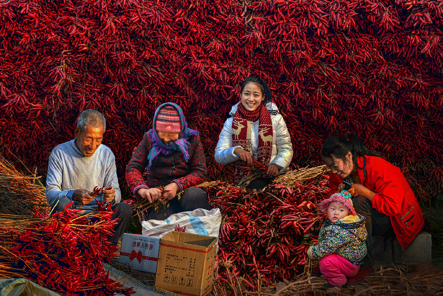 河南省西華縣紅花集鎮(zhèn)周寨村依靠農(nóng)副業(yè)種植打贏扶貧攻堅戰(zhàn),他們積極開展紅辣椒種植,人均年收入過萬元,日子過得紅紅火火,家家脫貧摘帽向著小康社會邁進?。ɡ顐?攝)