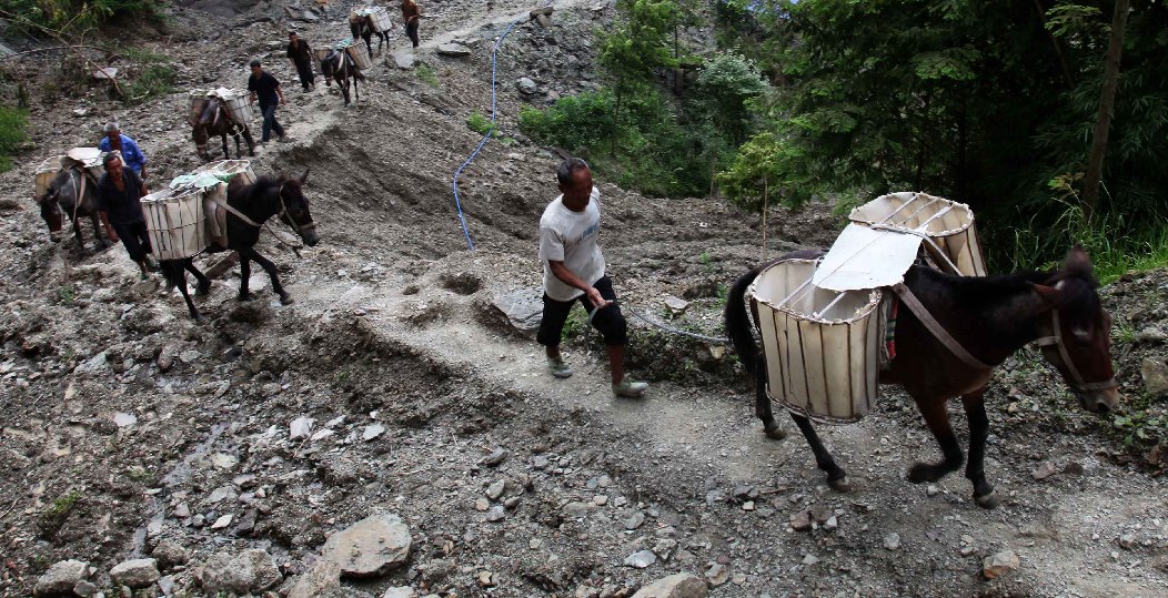 交通運輸難問題突出,肩挑背磨和牲畜托運是貧困山區(qū)物資運輸?shù)闹饕绞健D為重慶市黔江區(qū)貧困鄉(xiāng)村馬幫運輸農(nóng)用物資場景。(楊敏 攝)
