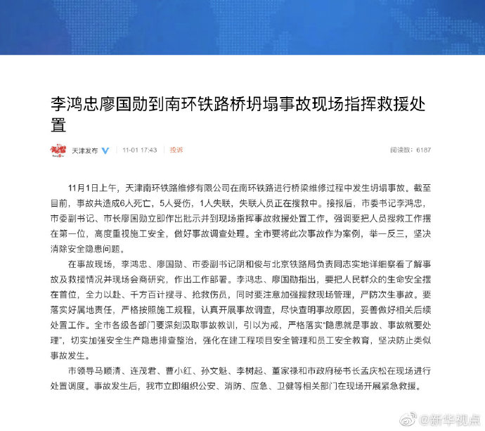 11月1日上午,天津南環鐵路維修有限公司在南環鐵路進行橋梁維修過程中發生坍塌事故。截至目前,事故共造成6人死亡,5人受傷,1人失聯,失聯人員正在搜救中。?
